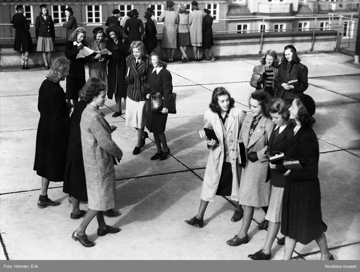 Skolungdom. Flickor promenerar och pratar med varandra på ett hustak.