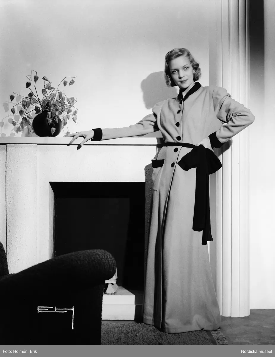 Modell i ljus hemmarock med svarta detaljer och svart skärp. Modellen står vid en öppen spis, blomvas på spisen, fåtölj i hörnet.