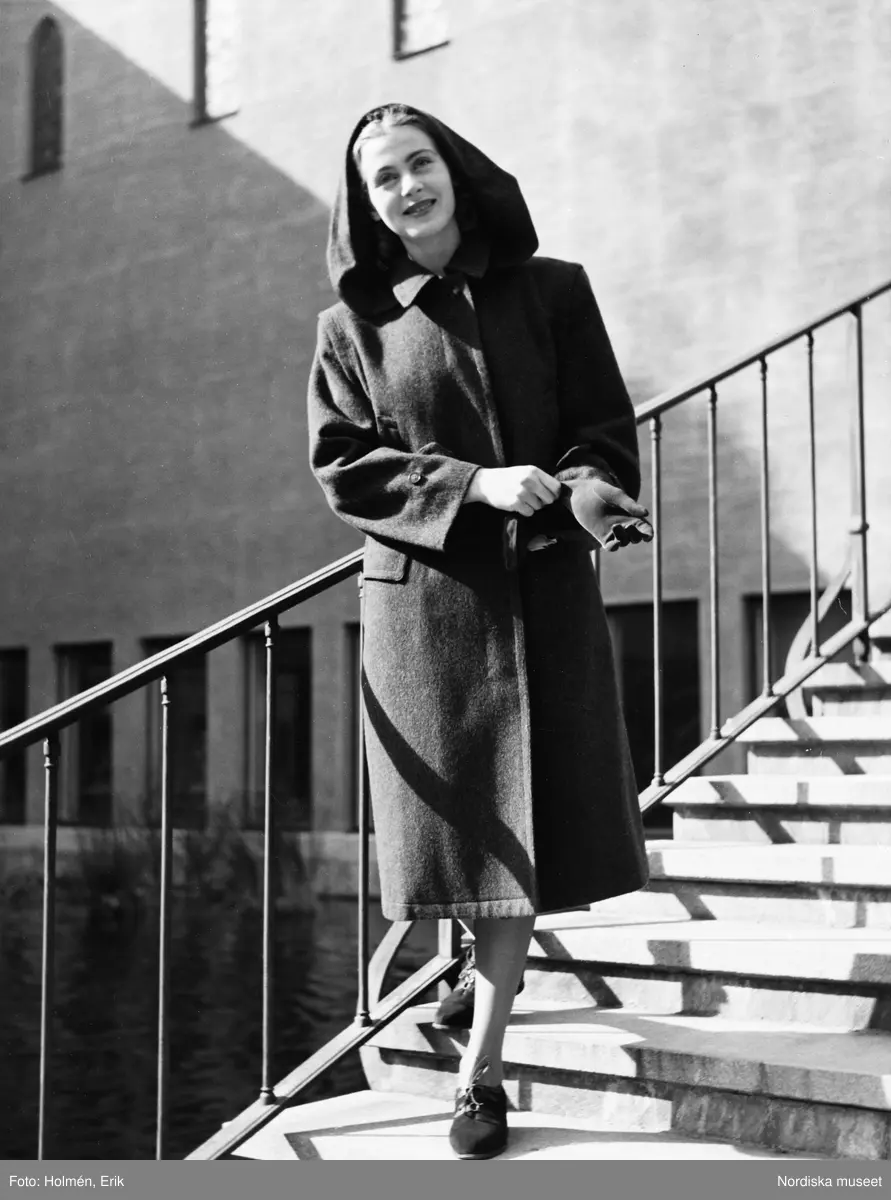 Modell klädd i kappa med kapuschong, snörskor och handskar. Håller ena handsken i handen. Modellen går nedför en trappa, vatten och byggnad i bakgrunden.
