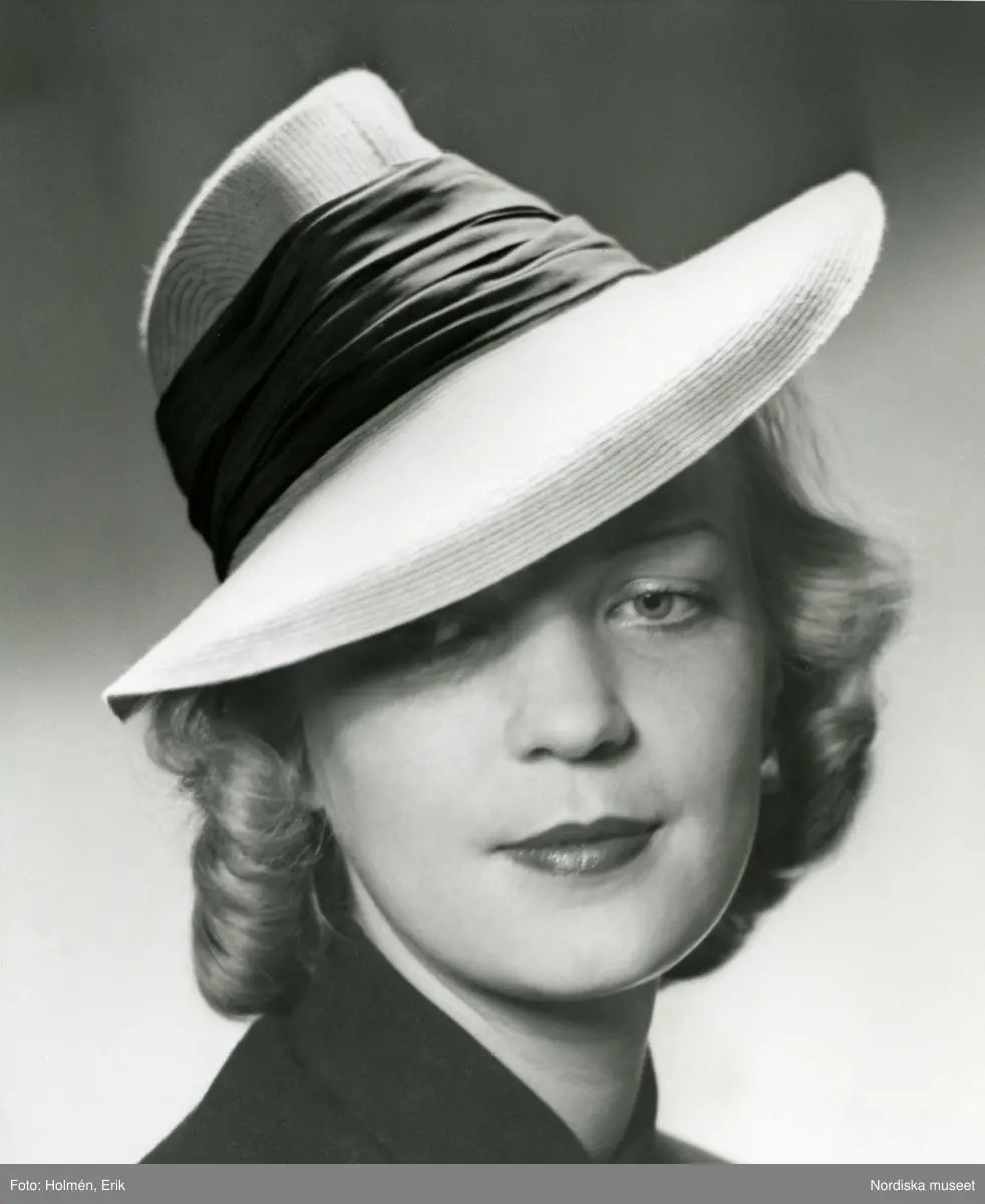 Porträtt av kvinna i ljus hatt med mörkt band.