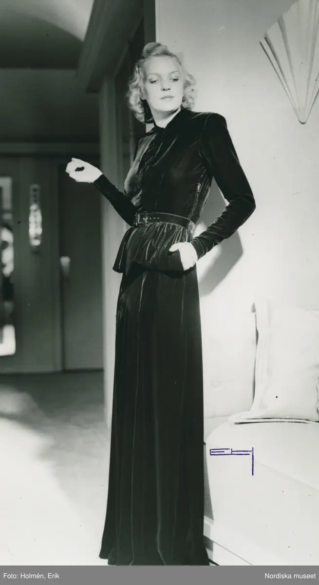 Helporträtt av kvinna i hellång sammetsklänning. Mannekängen Margit Langlet på NK:s Franska damskrädderi.