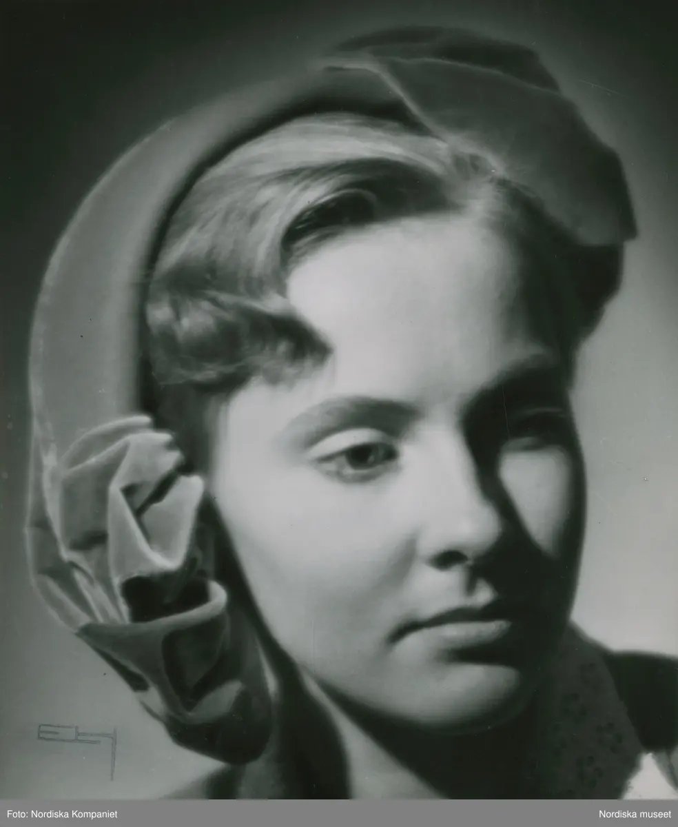 Porträtt av modell i draperad taftsammet med uppsvängt brätte av filt, färg lindblomsgrön. Från Rose Valois.