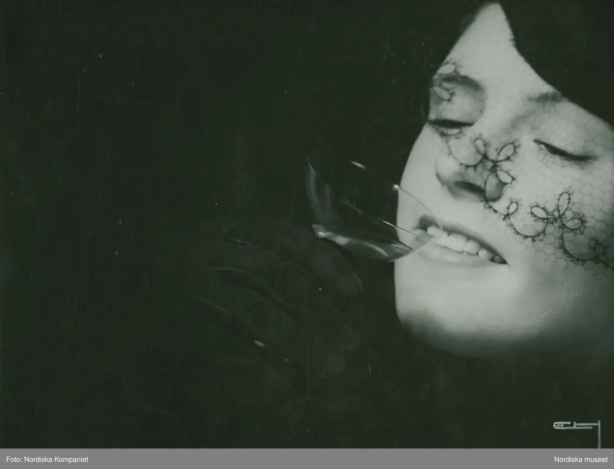 Närbild av modell i svart hatt med flor, svarta handskar och ett cocktailglas. Nordiska Kompaniet.