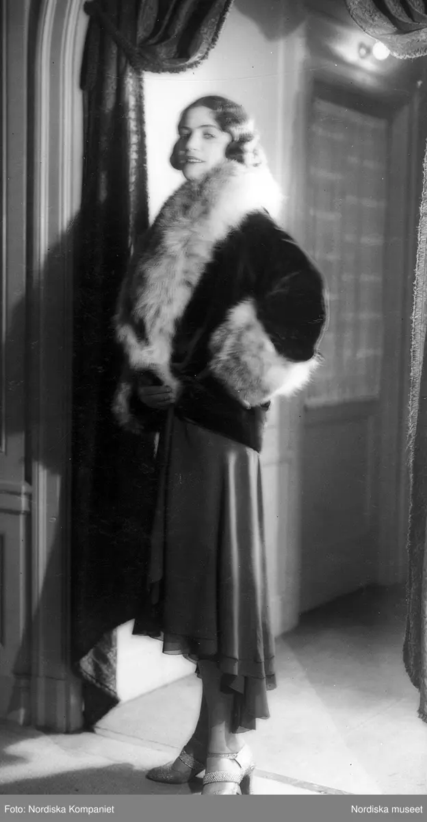 Mannekäng klädd i blå, klockad klänning i georgette från Lucien Lelong med jacka av blå sammet kantad med lopäls. NK:s Franska damskrädderi.