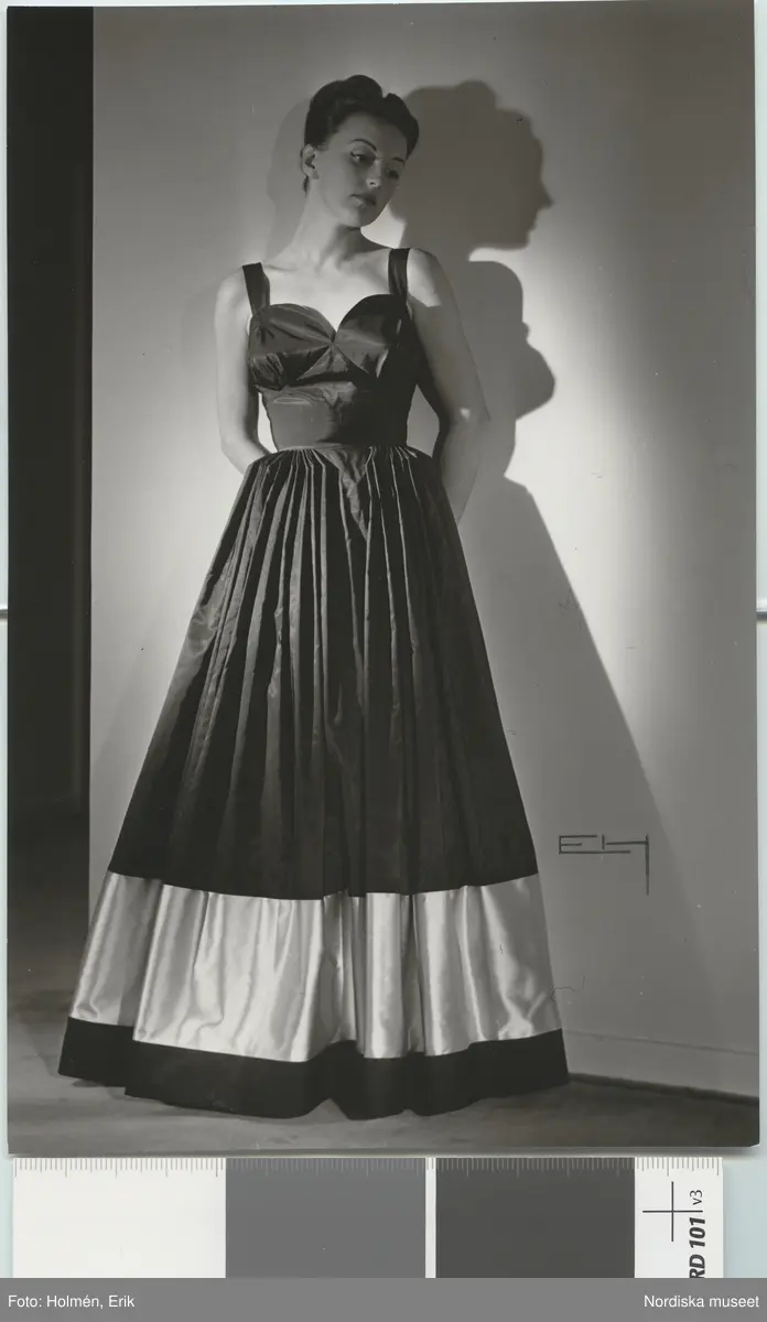 Nordiska Kompaniet. Kvinna i vit och svart aftonklänning med breda axelband. Text på baksidan: "Jean Patou Uppvisningen september 1947"