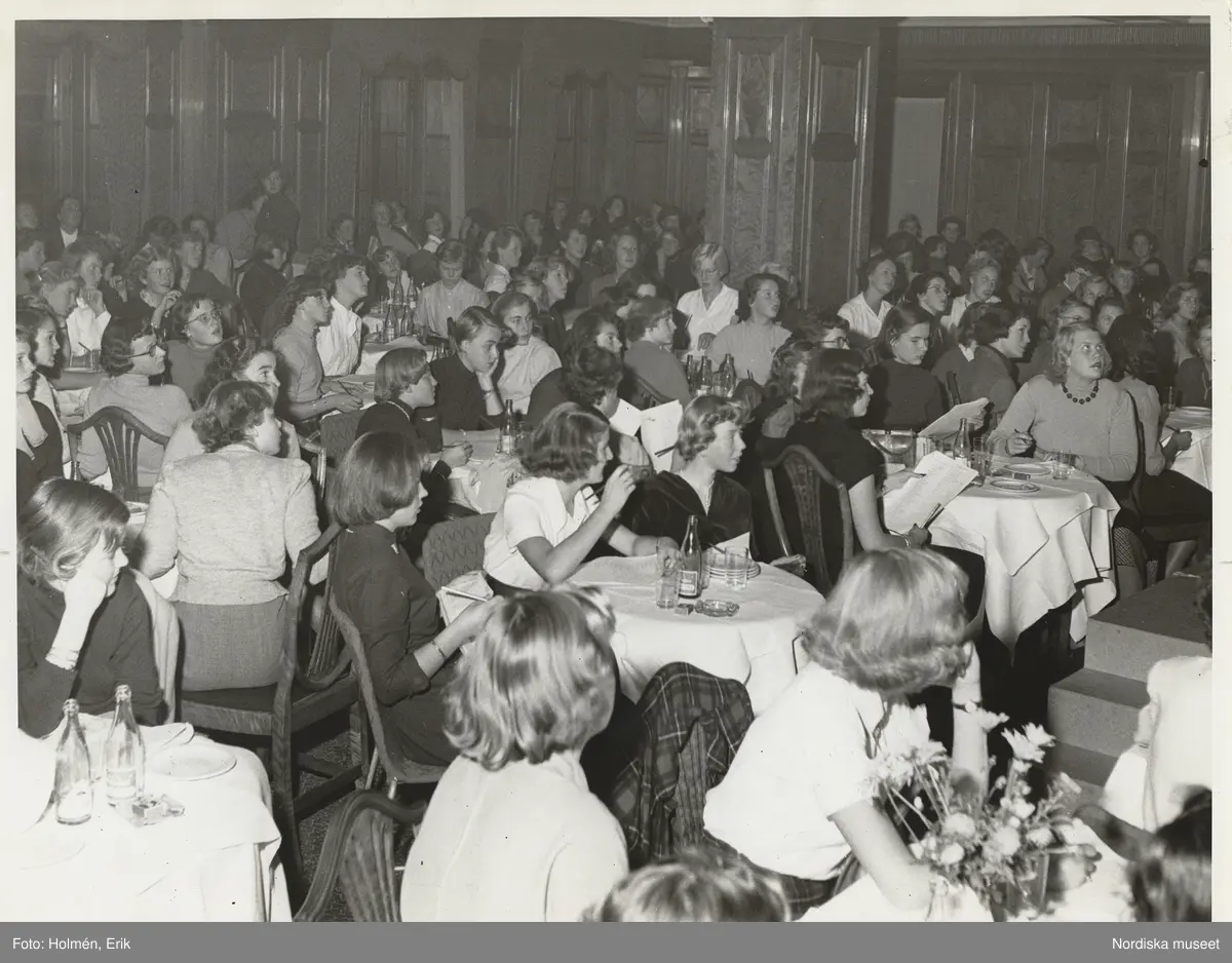 Nordiska Kompaniet. Tonårsmode 1950. Interiör med ung modepublik vid dukade bord med läskedrycksflaskor. Text på baksidan: "Första tonårsvisn. f. inbjudna hösten 1950. Tonårsmodet"