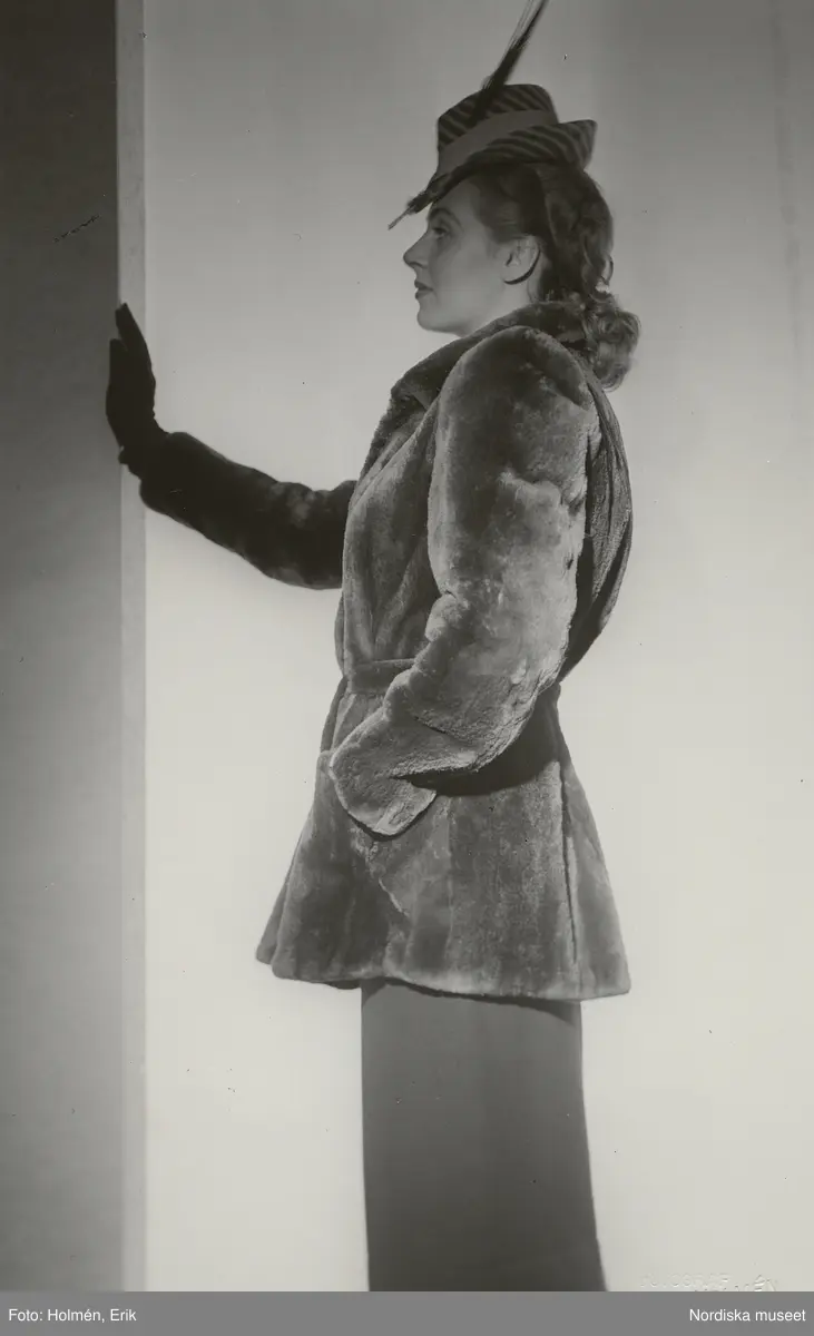 Nordiska Kompaniet. Kvinna i kjol och höftlång pälsjacka. Diagonalrandig hatt med fjäder.