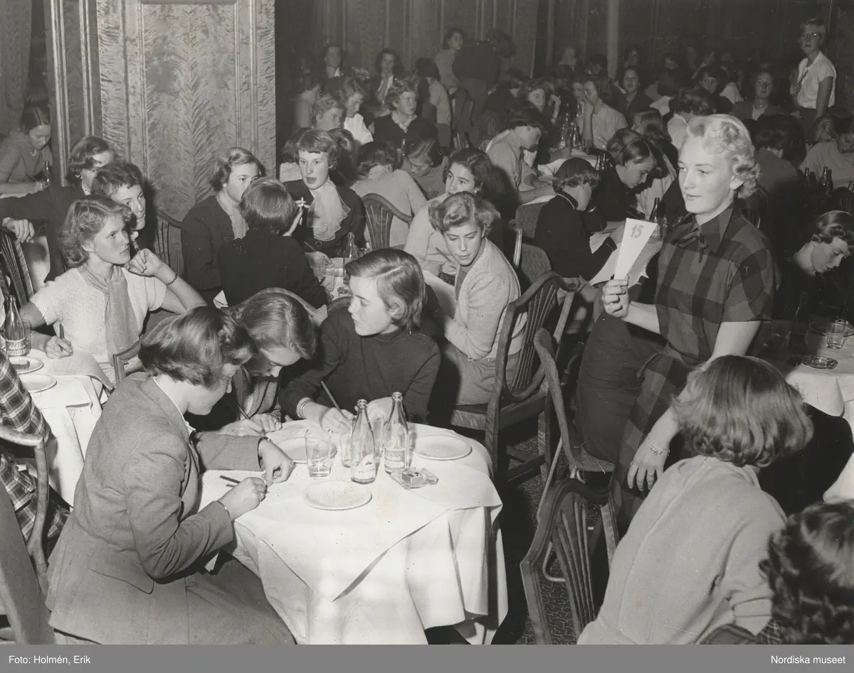 Nordiska Kompaniet. Tonårsmode 1950. Kvinna i mörk rutig klänning med kort ärm. Runt henne en ung modepublik vid dukade bord med läskedrycksflaskor. Text på baksidan: "Tonårsmodet 1950"