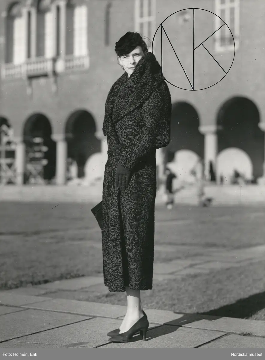 Nordiska Kompaniet. Exteriör Kvinna i mörk päls med hög och bred krage. Svart hatt med flor. I bakgrunden Stockholms stadshus arkad.