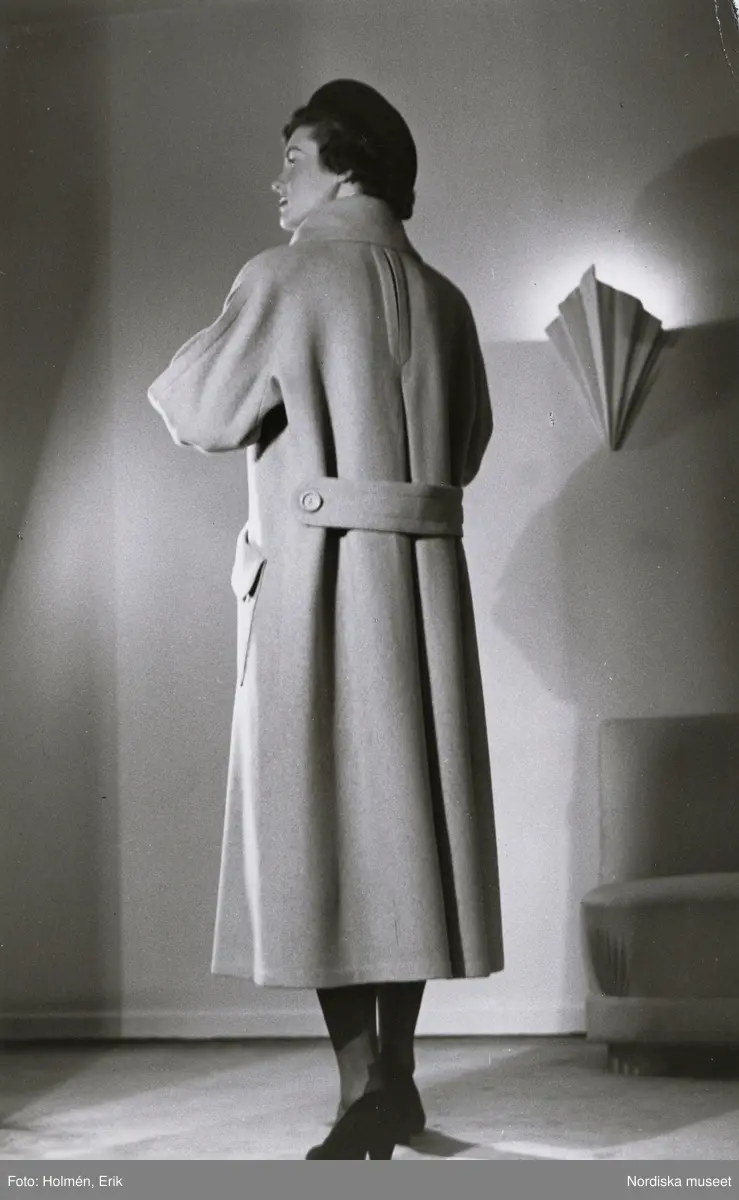 Nordiska Kompaniet. Kvinna i ljus kappa med slejf i ryggen. Text på baksidan: "Mad. de Rauch Mars 1949"