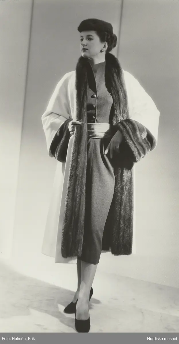 Modell i klänning med band i midjan, ljus kappa med pälskant och pälsbasker. Från Balmain.