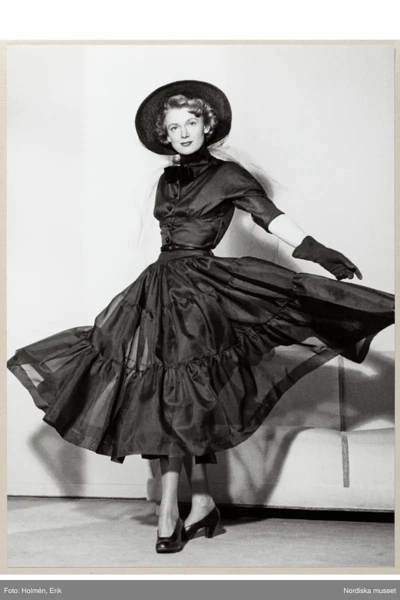 Mannekäng visar plagg i provrummet. Klänning med skjortblusliv och armbågslång ärm. Midjan markerad med skärp, rosett i halsen, vadlång, vid kjol med volanger. Hatt, handskar och pumps. NK:s Franska damskrädderi.