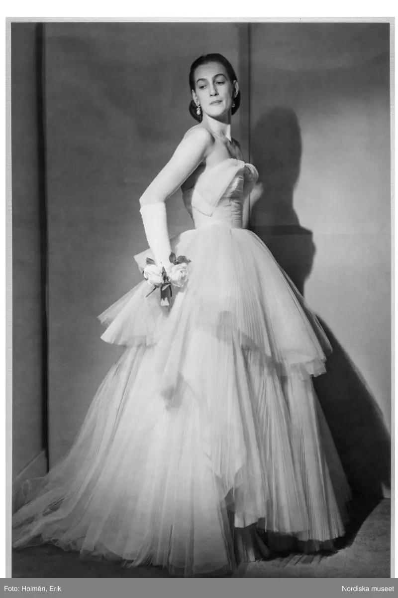 Mannekäng poserar iklädd festplagg i provrummet på NK:s Franska damskrädderi. Aftonklänning av finplisserat tyg med bara axlar. Figurnära liv med nedvikta kanter vid dekolletaget, hellång kjol i flera lager och längder, litet släp. Kvinnan bär glacéhandskar och örhängen med stor pärla, liten blombukett.
