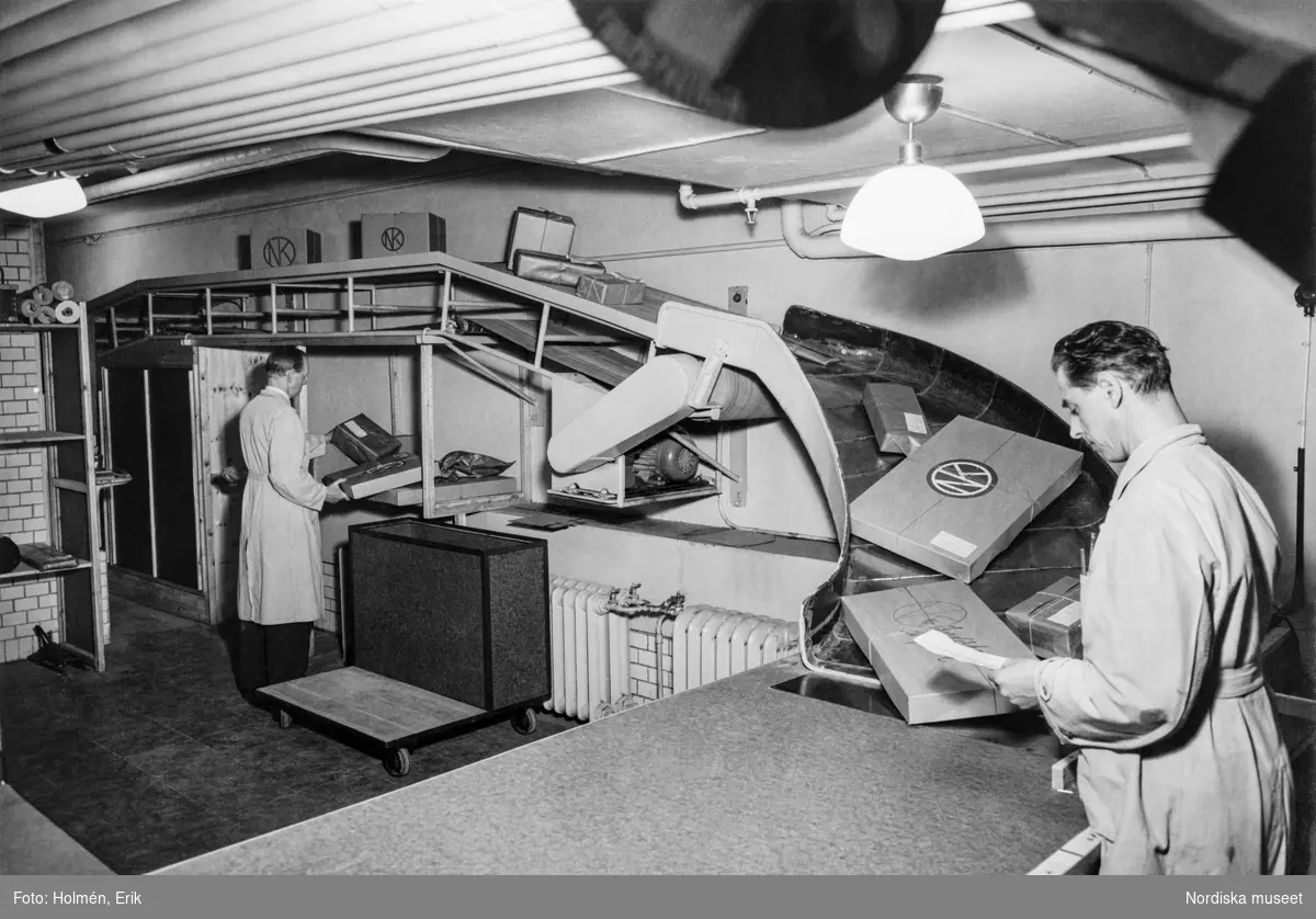 Paketbana i varudistributionen på varuhuset Nordiska Kompaniet (NK) i Stockholm. Två män i arbetsrockar hanterar paket som ska levereras till kunder.
