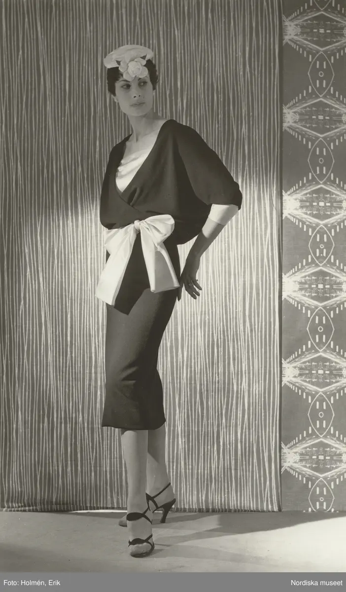 Modell i svart klänning med vit rosett i midjan och hatt med blomstergarnering.
