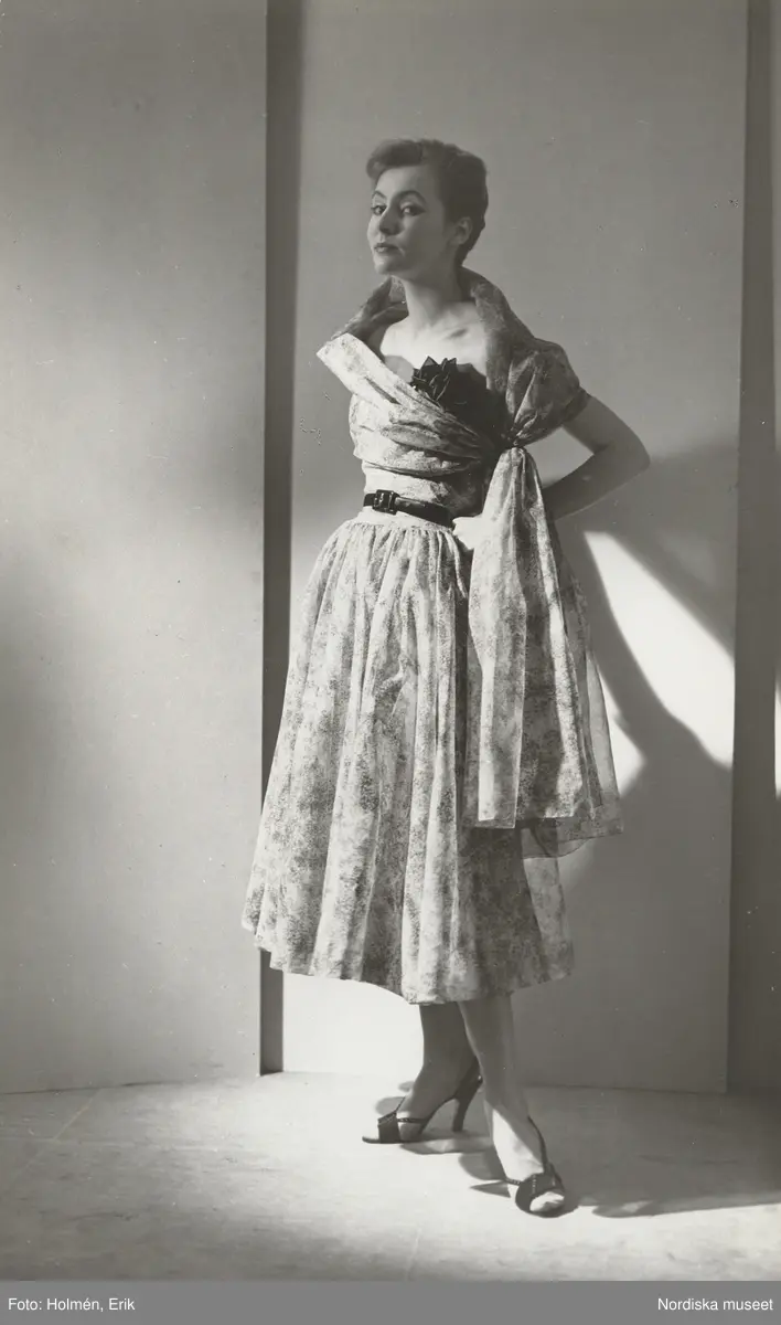 Modell i mönstrad klänning med sjal i samma mönster och mörk garneringsblomma. Från Balenciaga.