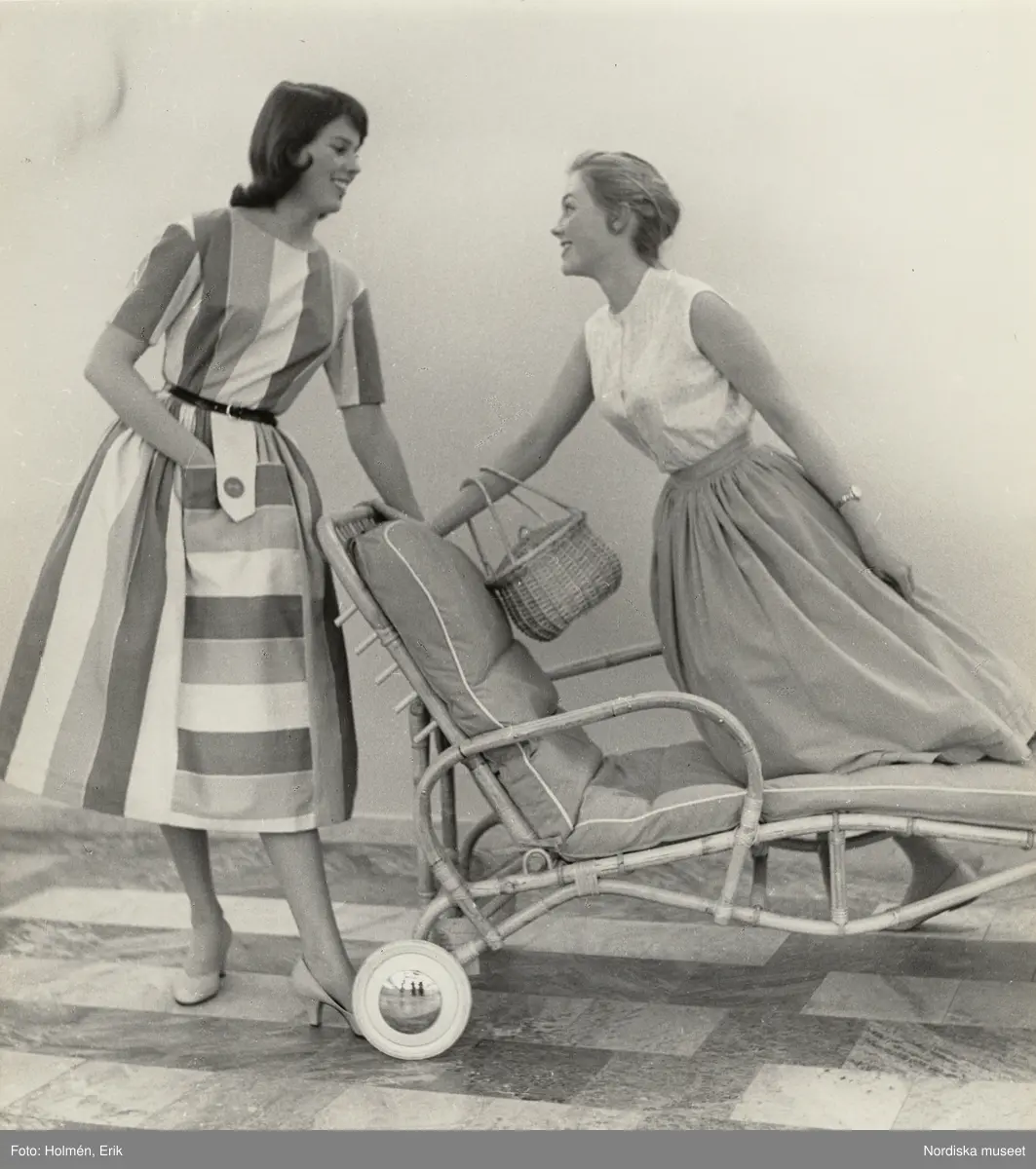 Kvinna till vänster i randig klänning och pumps, kvinna till höger i vit ärmlös blus och kjol med korg på armen, står på en solstol.