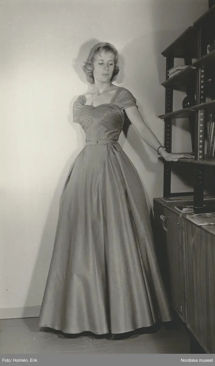 Tonårsmode. Modell i aftonklänning vid en byrå.