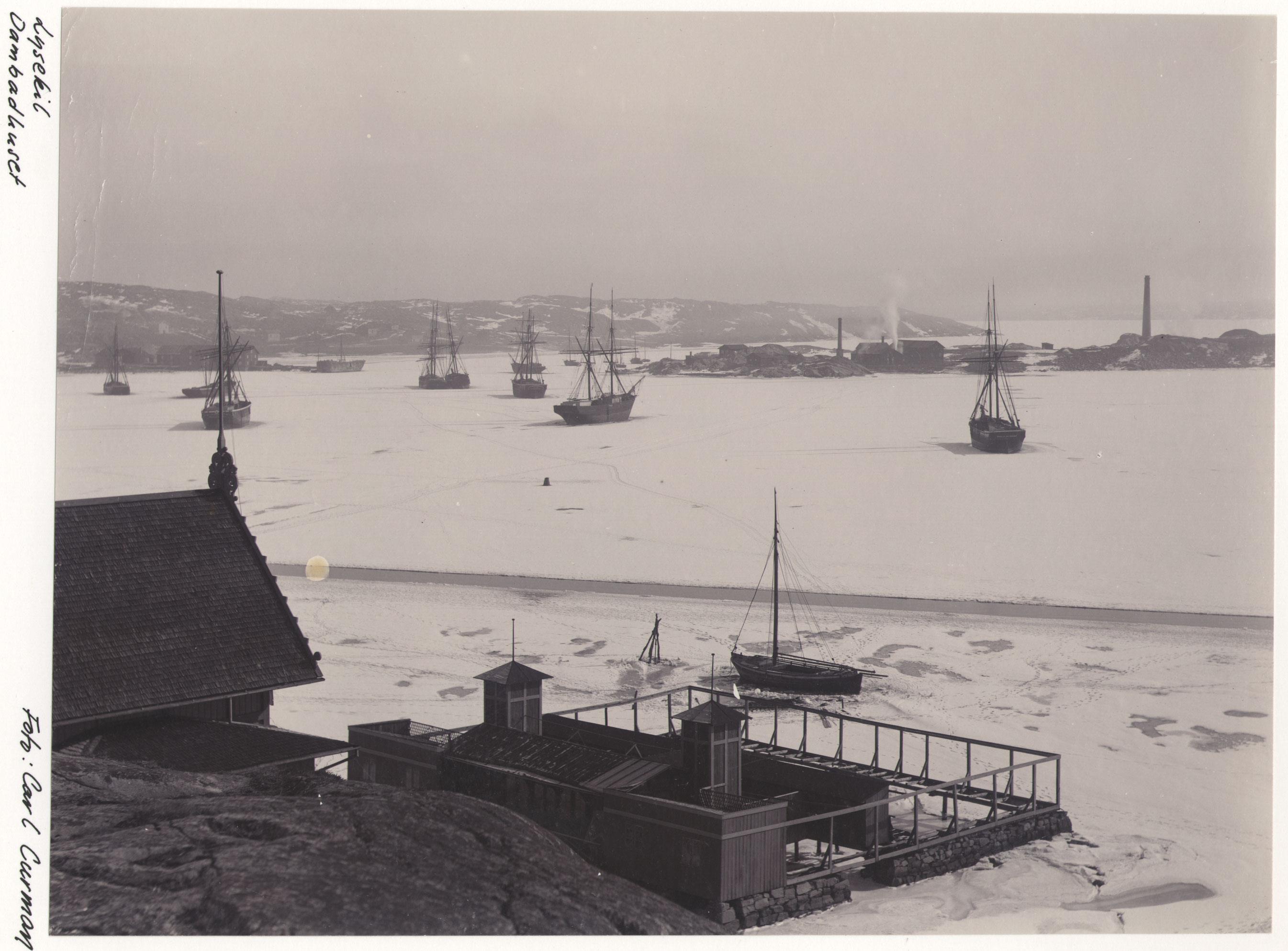 Dambadhuset och båtar i isen. Utsikt från "Kanonberget".