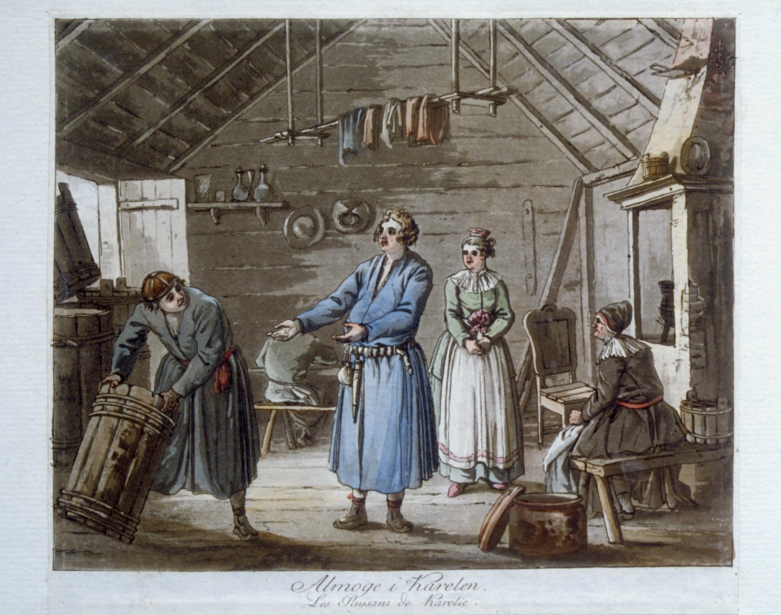 Allmoge i Karelen. Akvatint över konturetsning av Johan Fredrik Martin efter Pehr Hilleström d.ä. Ca 1800.