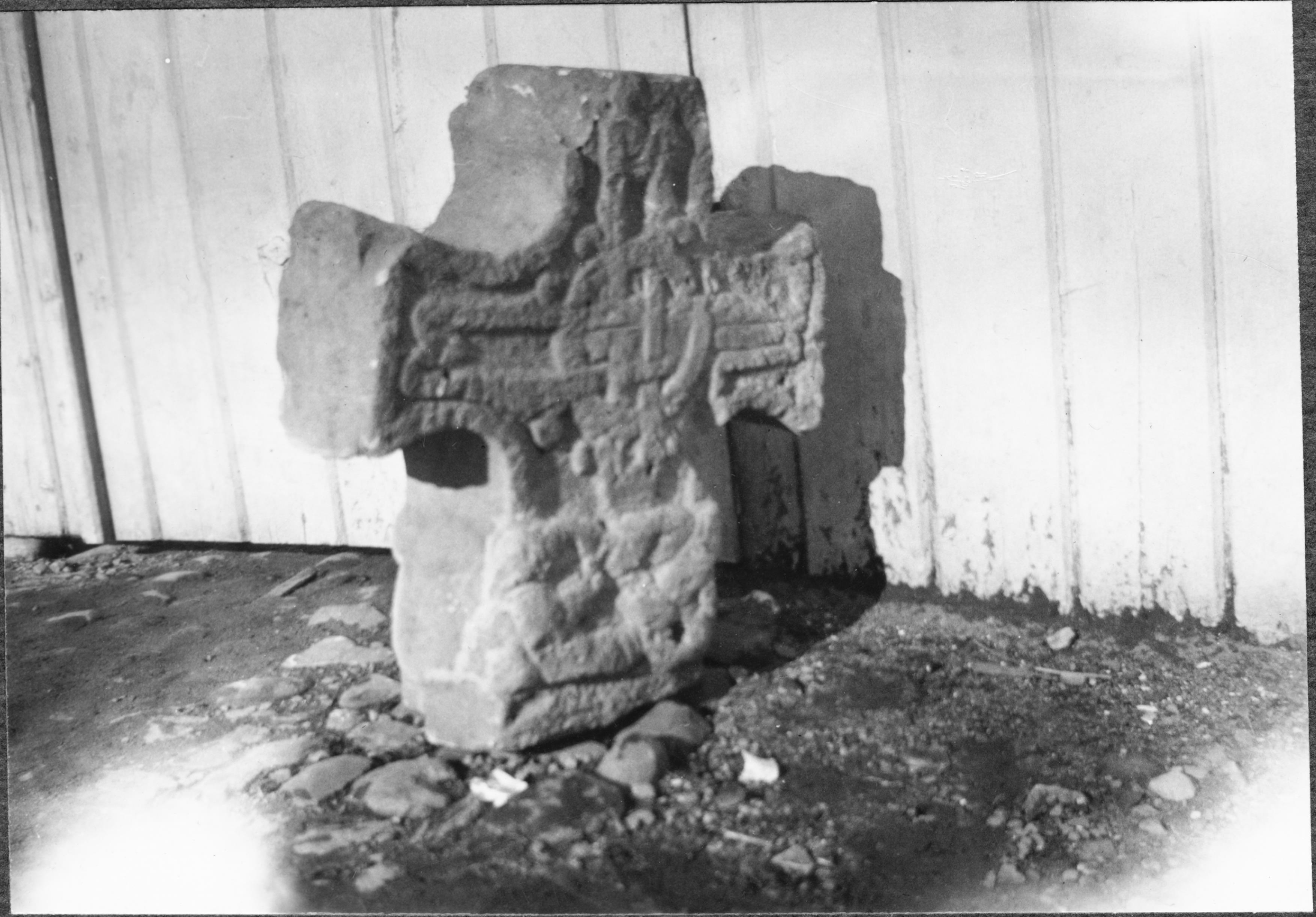 Sandstenskors, funnet på kyrkogården vid kyrkans södra långsida. Påträffades 1927.