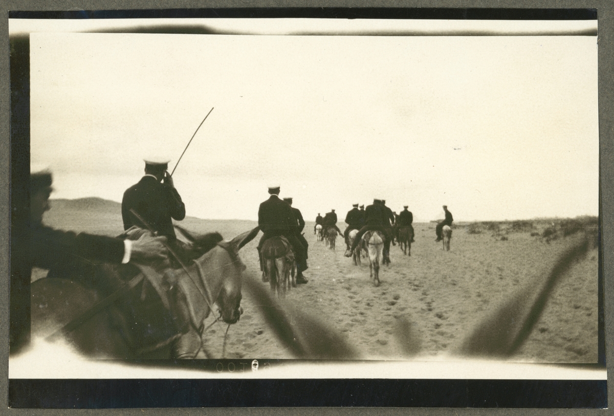 Bilden visar besättningsmän från Fylgia som rider genom öknen vid Giza på åsnor.