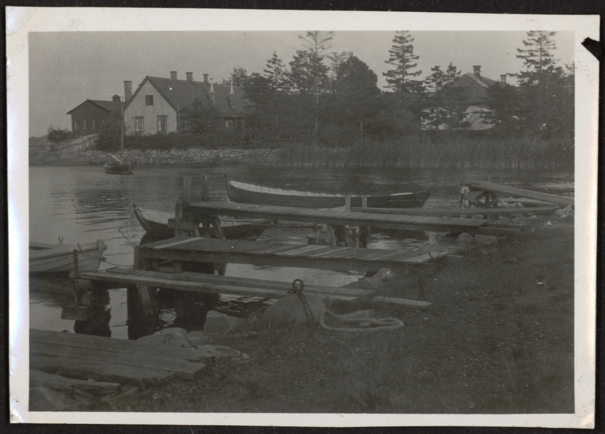 Bilden visar båtbryggor framför Slup- och barkasskjulet med vy på Epidemisjukhuset på Laboratorieholmen.