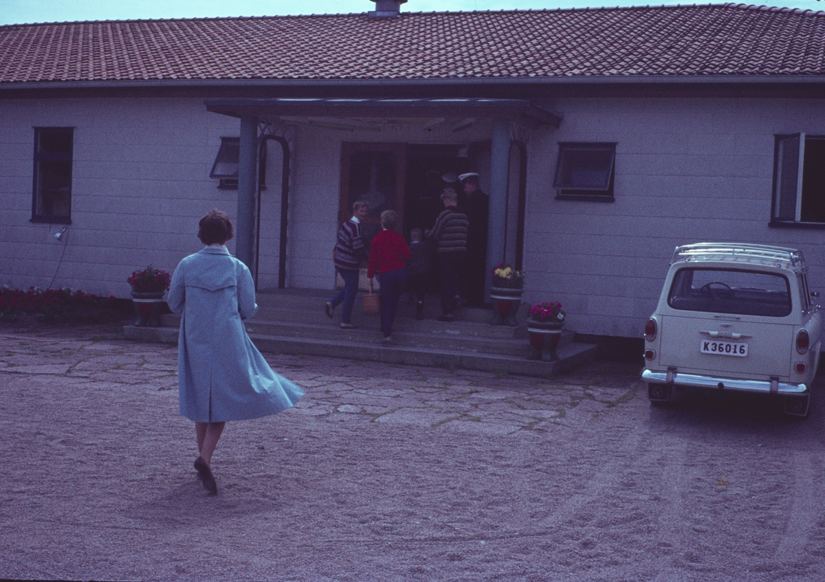 Bilden visar en kvinna i blå kappa som är på väg mot ett hus. Flera soldater och barn håller på att gå inomhus. På höger sidan parkera en bil.