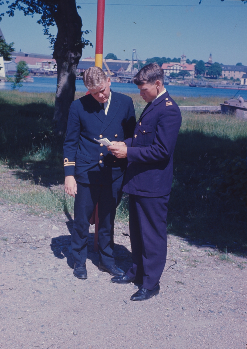 På bilden syns två sjöofficerare i tjänstegrad löjtnant i samtal på Lindholmen. I bakgrunden ser man örlogsvarvet i Karlskrona.