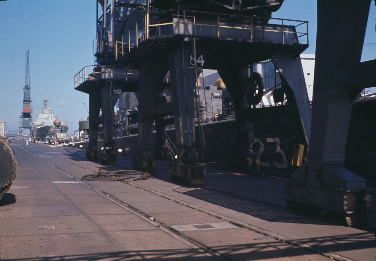 På bilden syns en kaj med hamnkranar. Bakom de ser man jagaren Hälsingland.