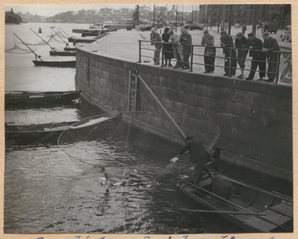 Bilden visar en fiskare på Strömmen som drar upp en bra fångst mitt i Stockholms innerstan.