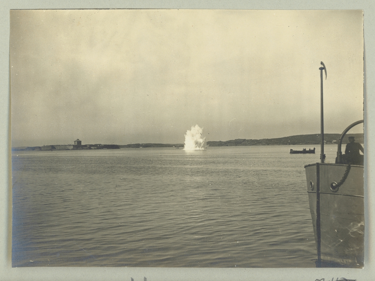 Bilden visar sprängning av en botten vid inloppet till Nya Älvsborg fästning.