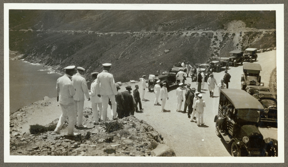 Bilden visar sjöofficerare från Fylgia på en utflykt med bilar på Chapmans Peak Road i Kapstad.