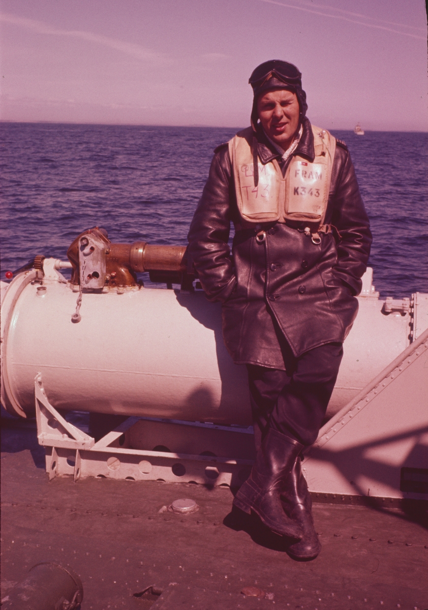 Bilden visar högbåtsman Gustav Nilsson med skyddskläder och flytväst ombord på T 43.