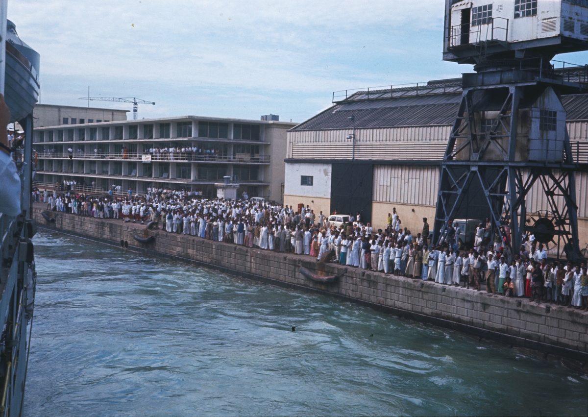 Bilden visar en folkmängd i hamnen av Colombo som inväntar Älvsnabben som håller på att lägga till vid kajen.