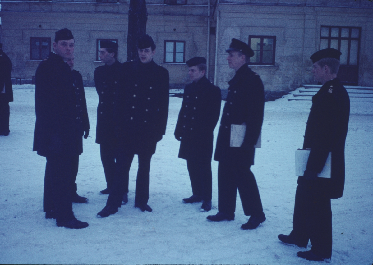 Bilden visar grupp elever från Flottans maskinavdelning på en snötäckt gård.