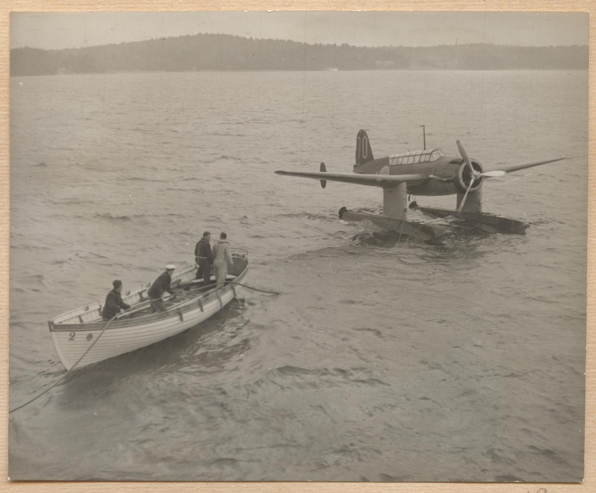 Bilden visar en slup som närmar sig en S 17 sjöflygplan som har landat på vattnet.