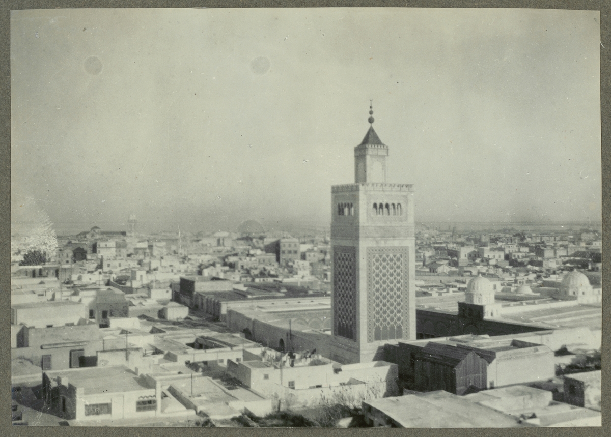 På denna stadsvy från Tunis dominerar minareten av Ez-Zitouna Moskén i mitten av bilden.