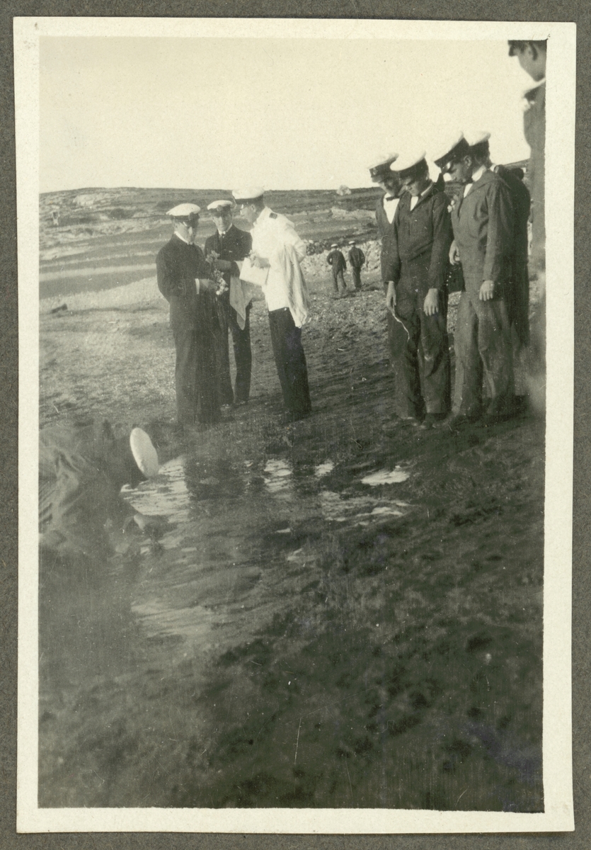 Bilden visar en grupp sjömän från Fylgia som intresserat tittar på hur en kamrat undersöker marken på Milos.