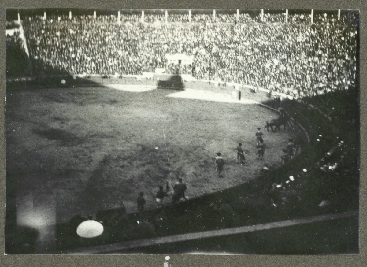 Bilden visar en pågående kamp i tjurfäkningsarenan av La Línea de la Concepción.