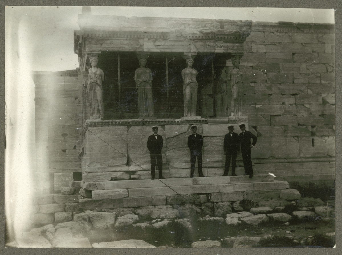 Bilden visar fyra sjömän från Fylgia som ta en gruppfoto framför Erechtheion templet på Akropolis.