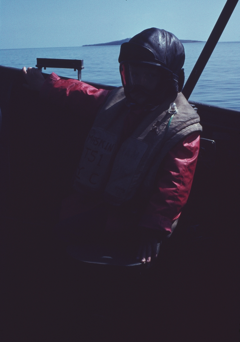 Bilden visaren kvinnlig besökare i skyddskläder ombord på en motortorpedbåt.