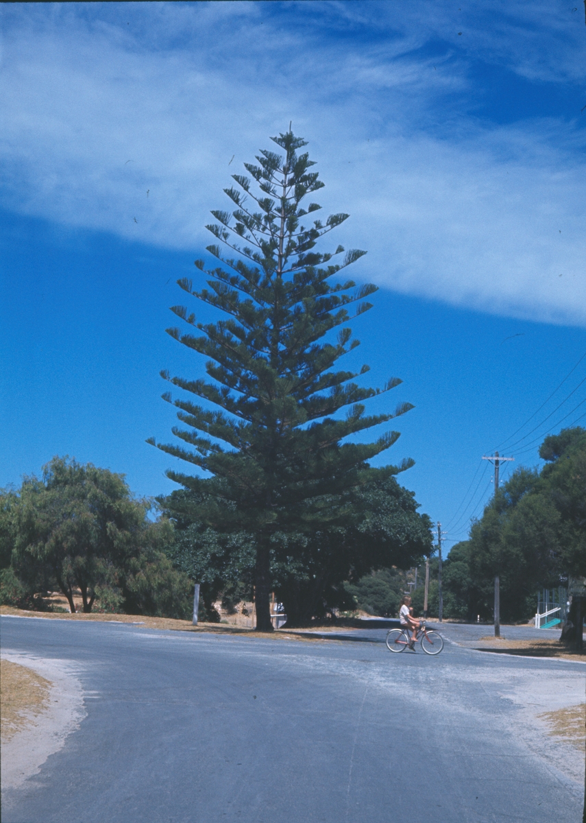 Bilden visar landskapet med en vägkorsning på Rottnest island. En flicka cyklar förbi barfotat.