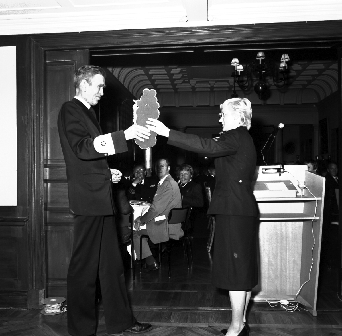 Bilder tagna vid sjösättningsmiddagen i samband med sjösättningen av minfartyget Carlskrona. Viceamiral Rudberg, klädd i uniform, tar emot ett föremål av en dräktklädd kvinna. I bakgrunden syns ett podium samt män som sitter vid ett bord.