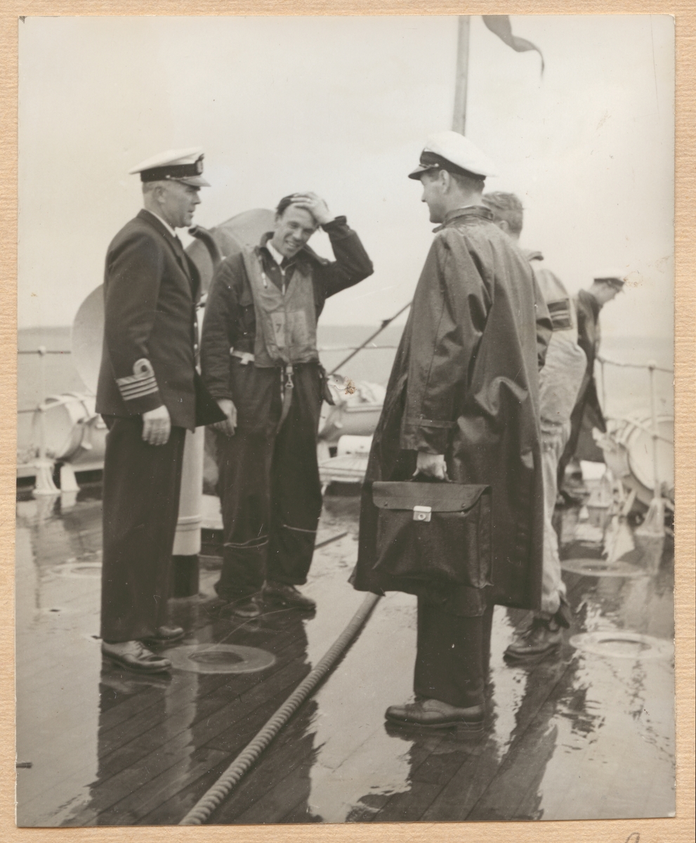 Piloten av Saab S 17 planen hälsas välkommen ombord på Fylgia av kommendör Forshell.