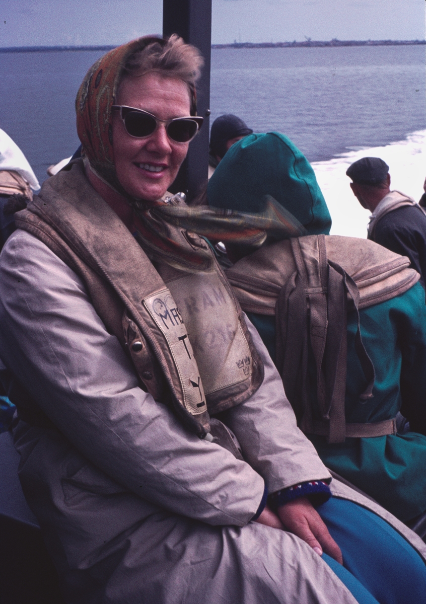 Bilden visaren kvinnlig besökare i skyddskläder ombord på en motortorpedbåt.