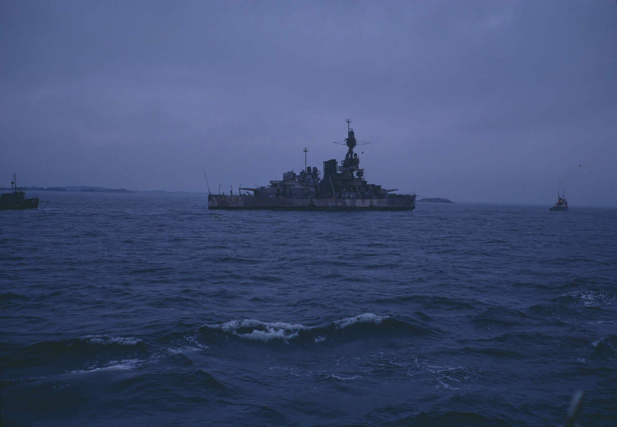 Bilden föreställer pansarkeppet Gustaf V under bogseringen.