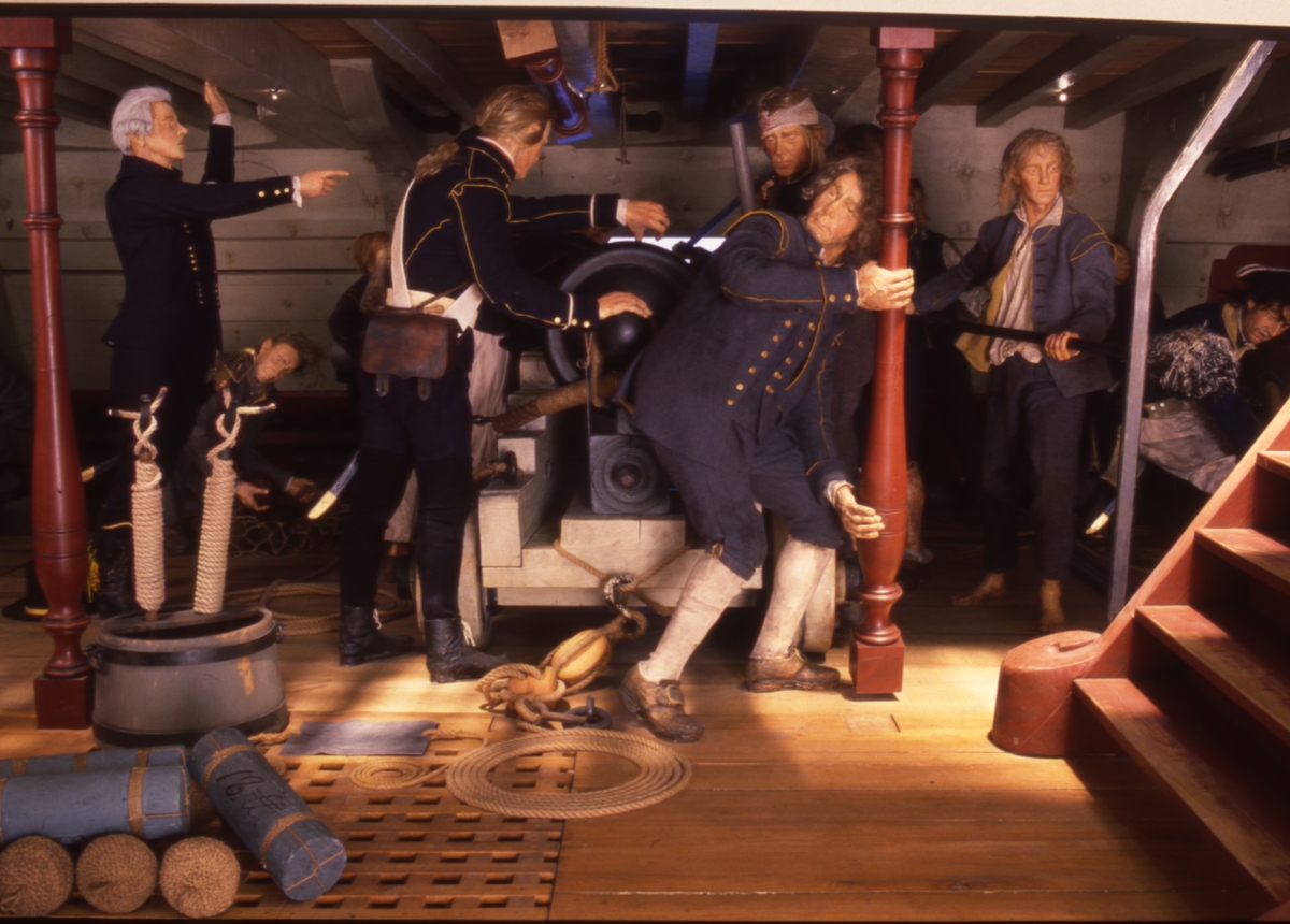 Utbrytningen vid Viborgska viken den 3 juli 1790 kl 07.00 på morgonen. Modellen i skala 1.1 på Marinmuseum visar aktiviteten på övre batteridäck två pjäser akterut. Scenografi och fakta Stefan Flöög. Figurerna tillverkades av Eva Ramqvist och Eva Morell.