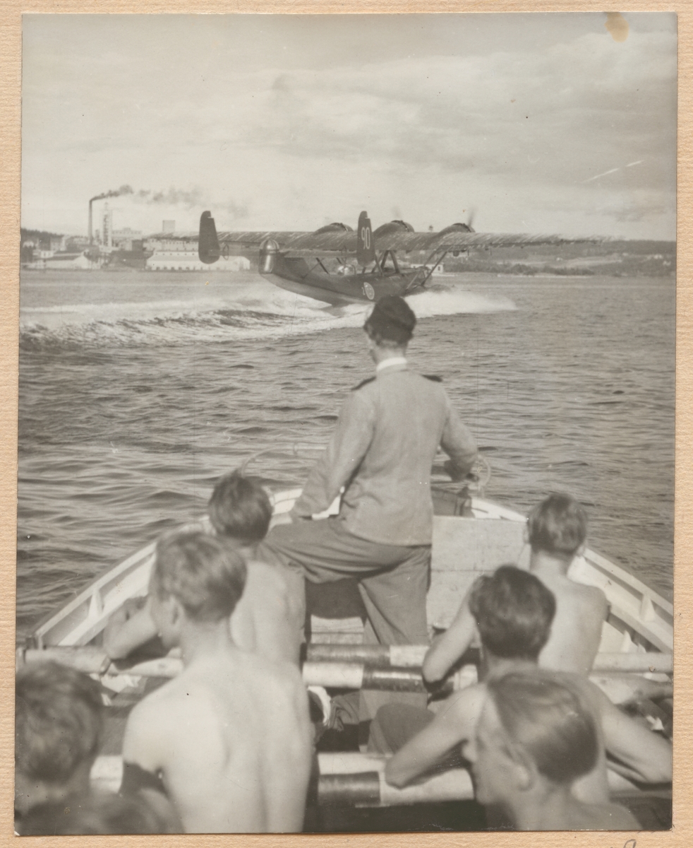 Bilden visar värnpliktiga i en roddbåt som tittar på den startande flygbåten Tp 24.