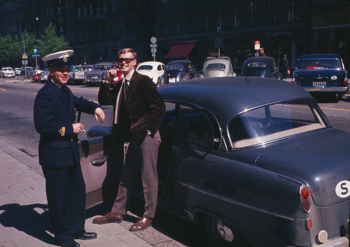 Bilden visar två unga män stående bredvid en bil i samtal med varandra. De ena är klädd i Flottans uniform av tjänstegrad furir i maskinavdelningen. Han röker en cigarett. Den andra är klädd i civila kläder och bär solglasögon.